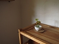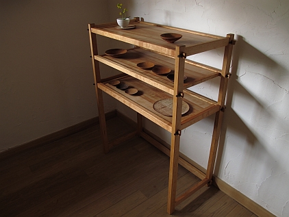本体はチェリー材、棚板はカタスギ(アズキナシ)材を使っています。本体自体が軽量で移動も楽ですが、通しほぞに入っているタガヤサン材の楔を抜けば、分解して運ぶことも出来ます。