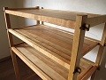 その蚕棚に着想を得たこの棚は、飾り棚、あるいは食器棚として製作しました。見た目のバランスを考え、ほんのわずかでわからないくらいに四隅の縦方向の部材を上に向かって細くしてあります。
