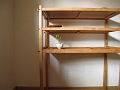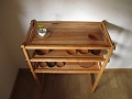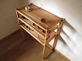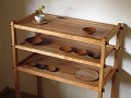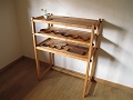 本体はチェリー材、棚板はカタスギ(アズキナシ)材を使っています。本体自体が軽量で移動も楽ですが、通しほぞに入っているタガヤサン材の楔を抜けば、分解して運ぶことも出来ます。