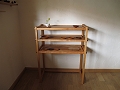 その蚕棚に着想を得たこの棚は、飾り棚、あるいは食器棚として製作しました。見た目のバランスを考え、ほんのわずかでわからないくらいに四隅の縦方向の部材を上に向かって細くしてあります。
