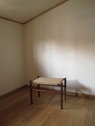 そのブラックウォールナット材で製作したスツールです。最小構成の部材数と最低限の太さと言うことを考えながら製作してみました。すっきりとして見た目をねらって、脚の先端の太さを細くしています。座面はデニッシュペーパーコードの鹿子編みです。